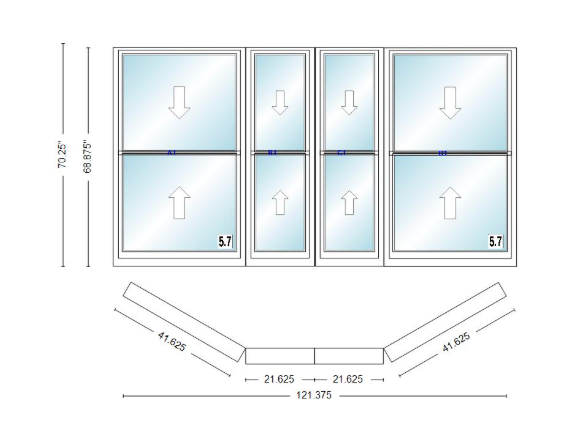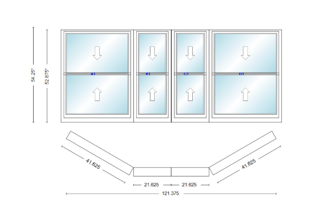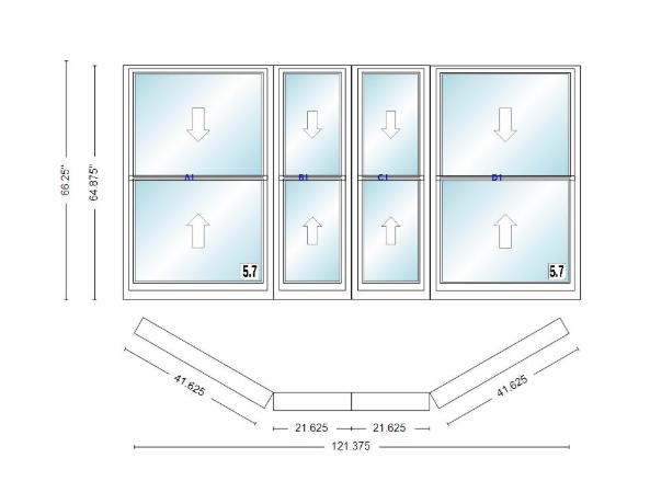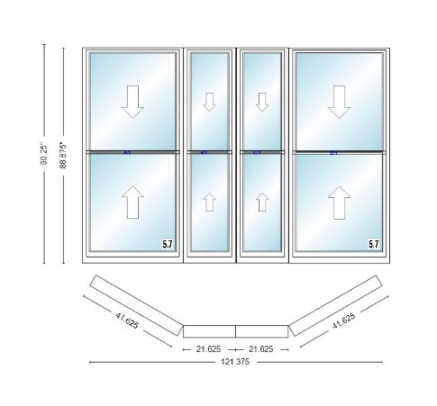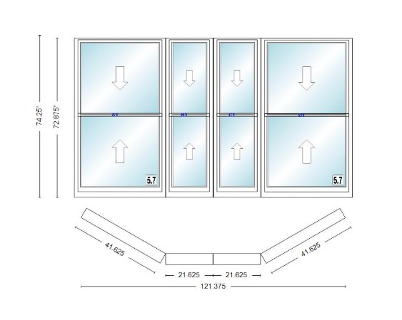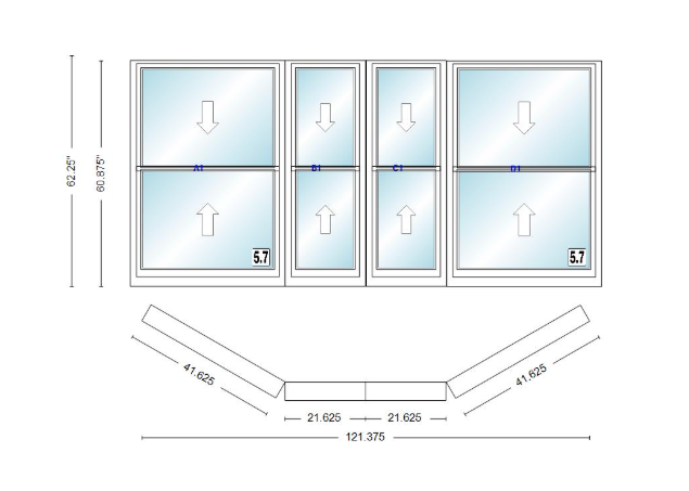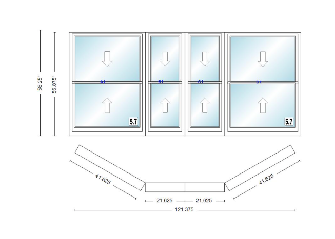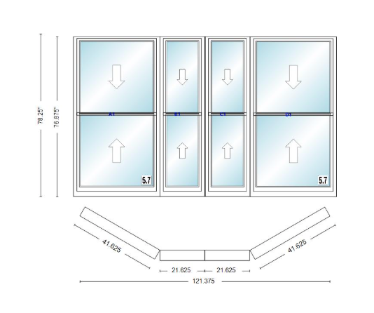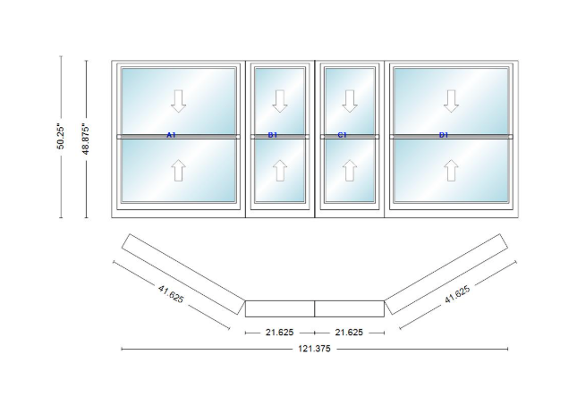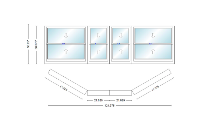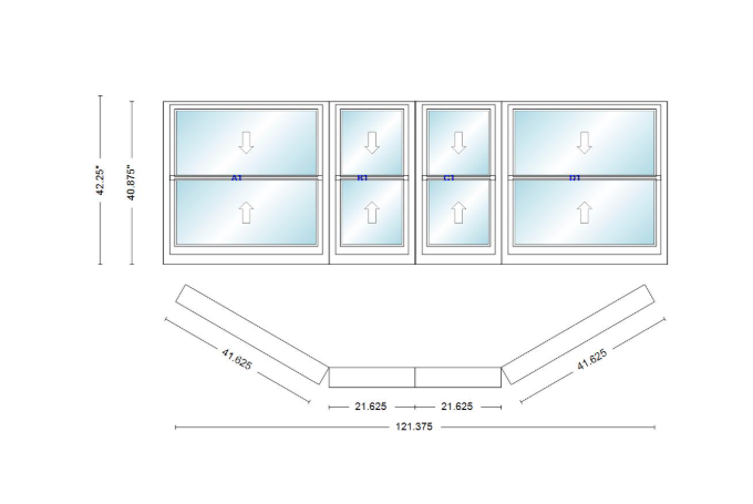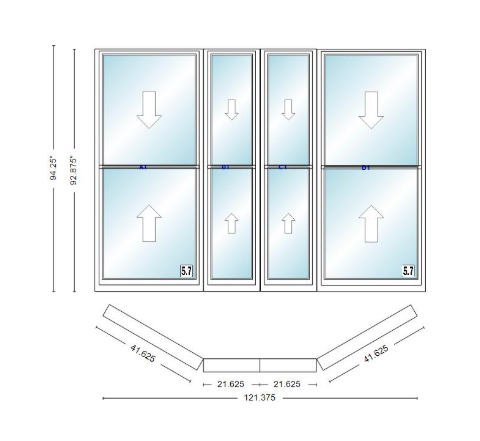 Andersen 400 series double hung bay window 121 3/8" wide double hung with double hung flankers 30 degree angle of deflection vinyl exterior wood interior low-e4 dual pane argon gas