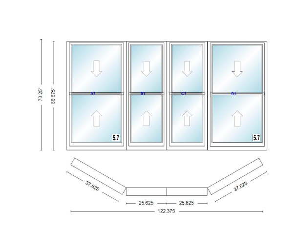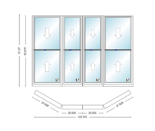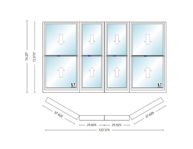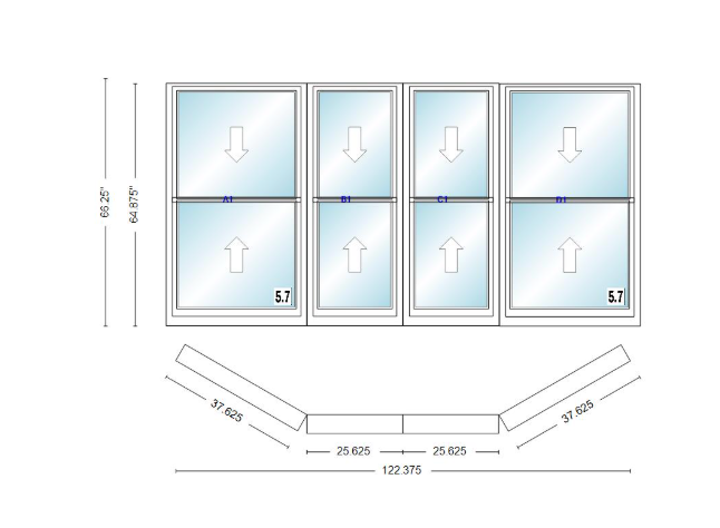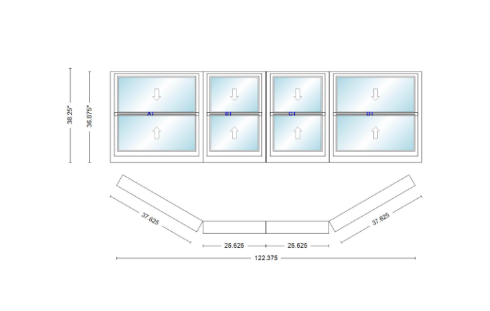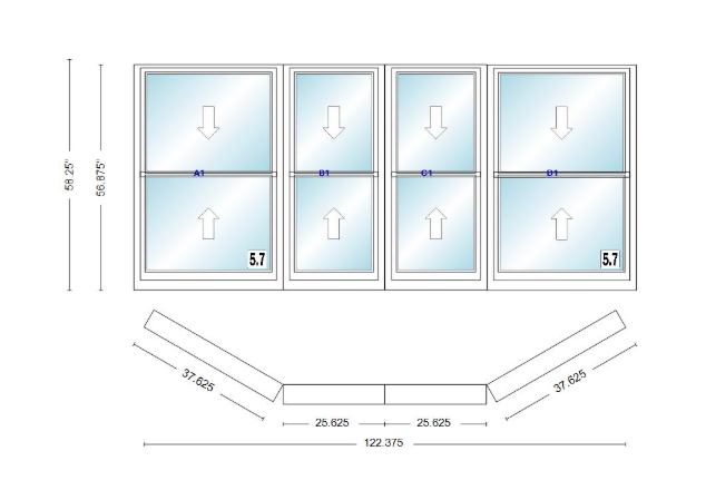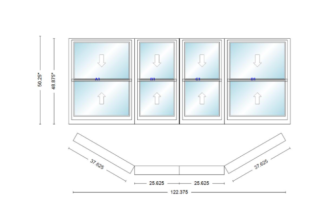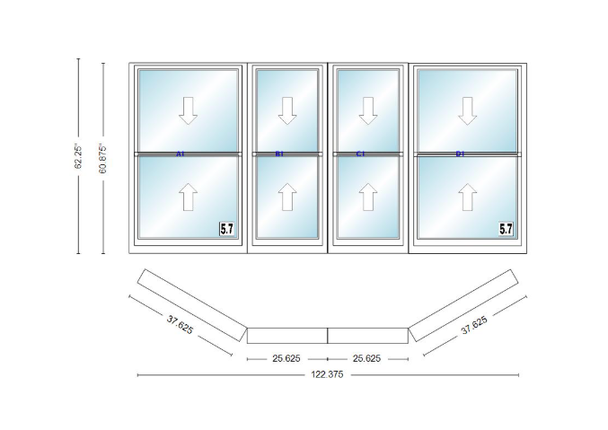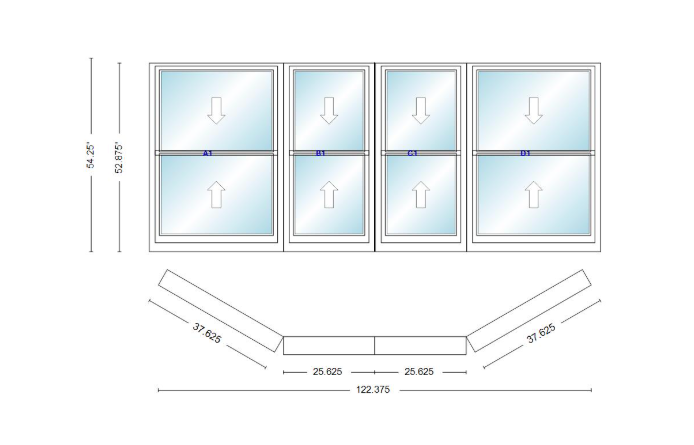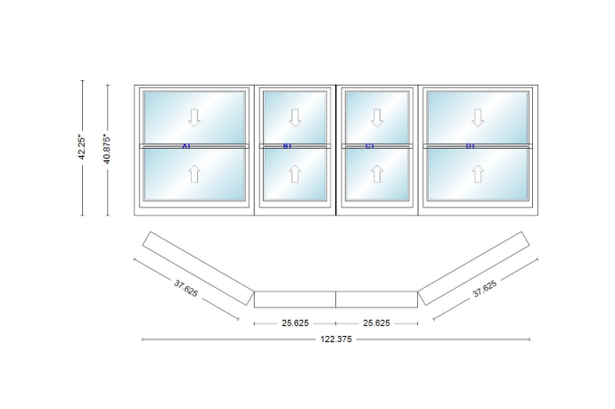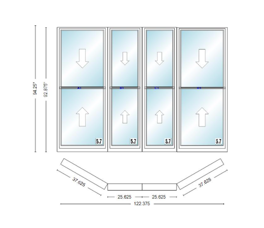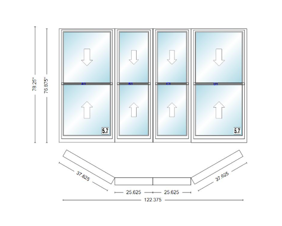Andersen 400 series double hung bay window 122 3/8" wide double hung with double hung flankers 30 degree angle of deflection vinyl exterior wood interior low-e4 dual pane argon gas
