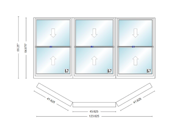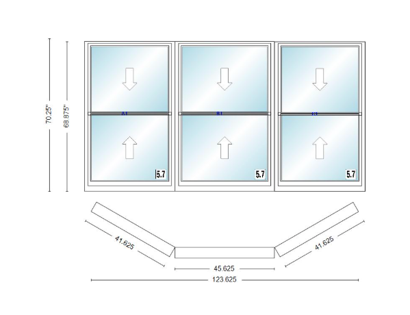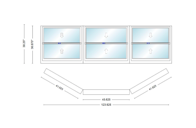 Andersen 400 series double hung bay window 123 5/8" wide picture with double hung flankers 30 degree angle of deflection vinyl exterior wood interior low-e4 dual pane argon gas