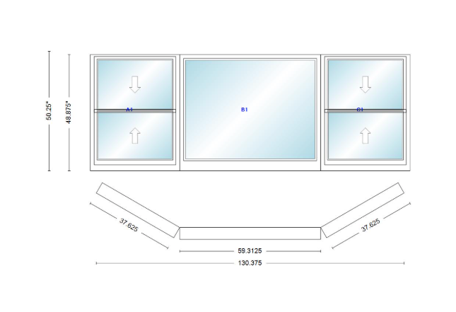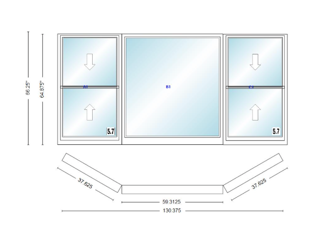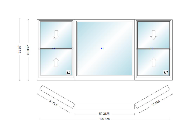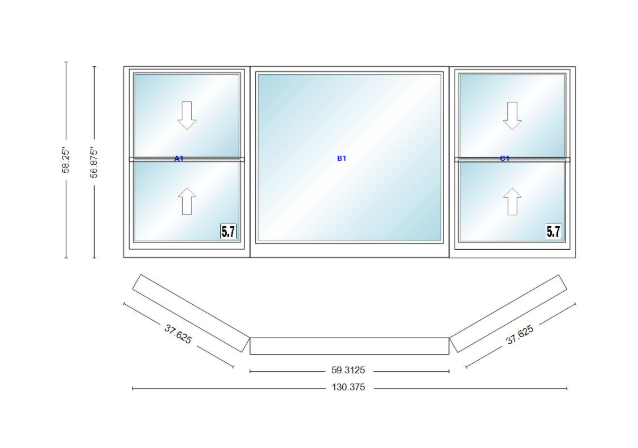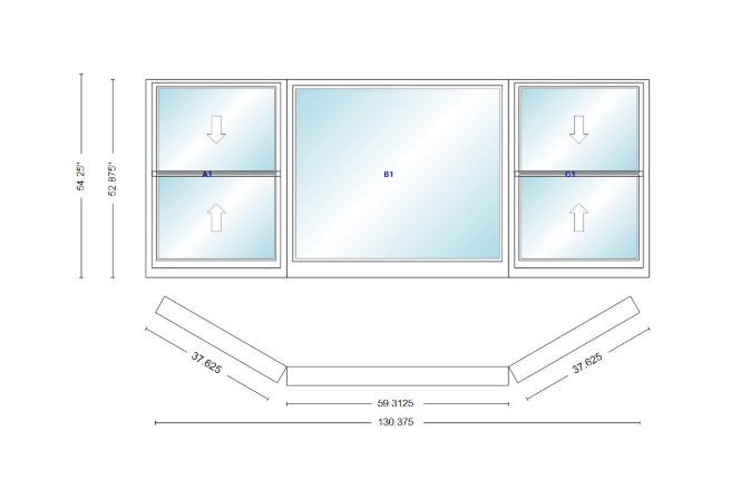 Andersen 400 series double hung bay window 130 3/8" wide picture with double hung flankers 30 degree angle of deflection vinyl exterior wood interior low-e4 dual pane argon gas