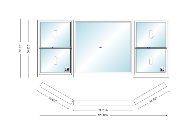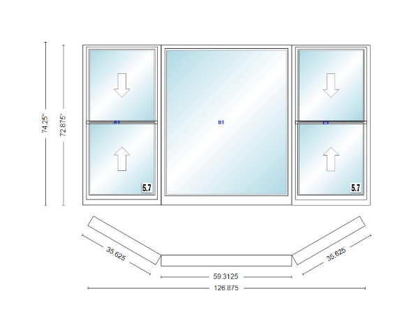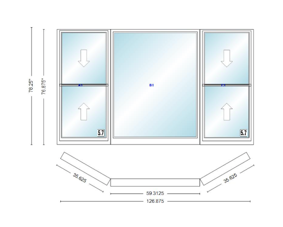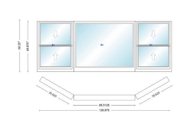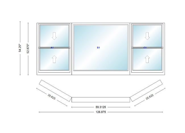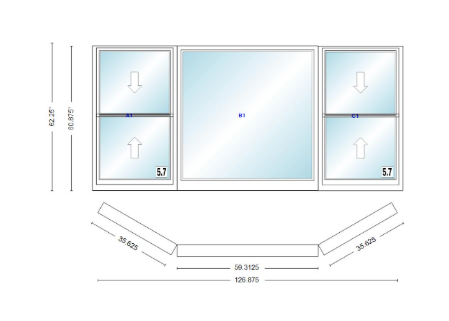 Andersen 400 series double hung bay window 126 7/8" wide picture with double hung flankers 30 degree angle of deflection vinyl exterior wood interior low-e4 dual pane argon gas