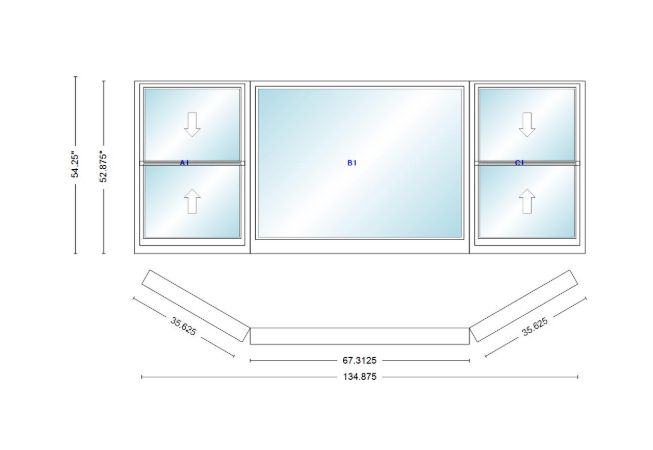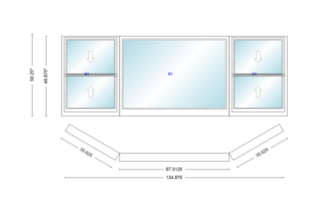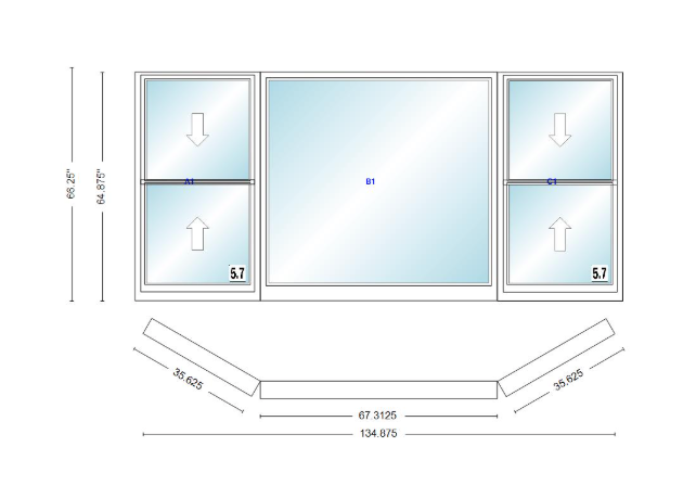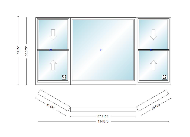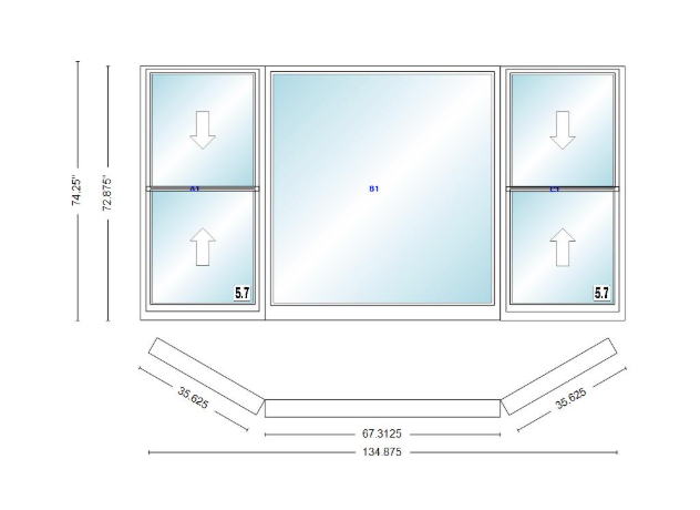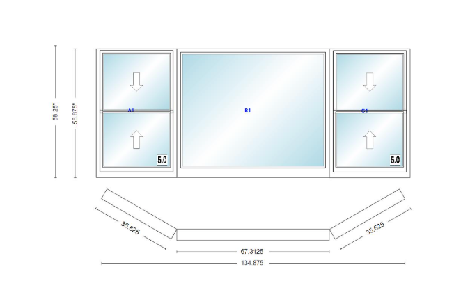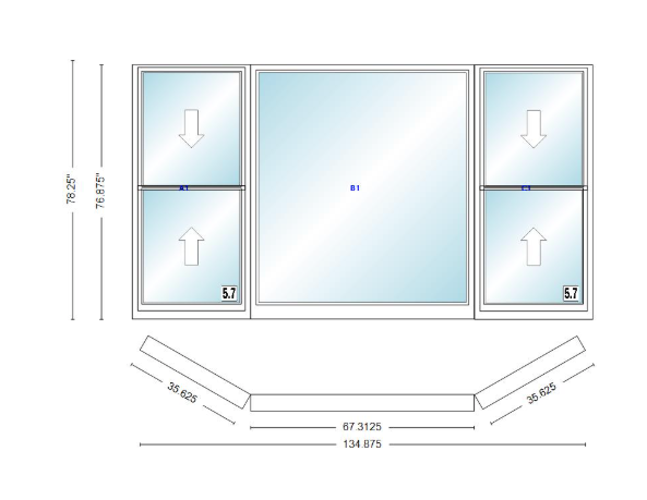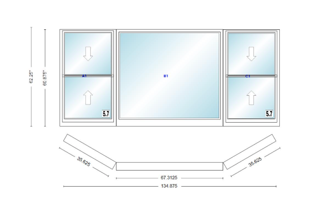 Andersen 400 series double hung bay window 134 7/8" wide picture with double hung flankers 30 degree angle of deflection vinyl exterior wood interior low-e4 dual pane argon gas