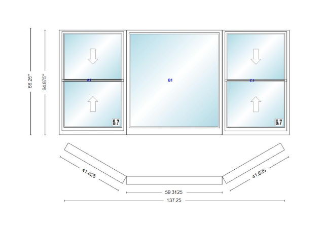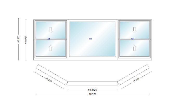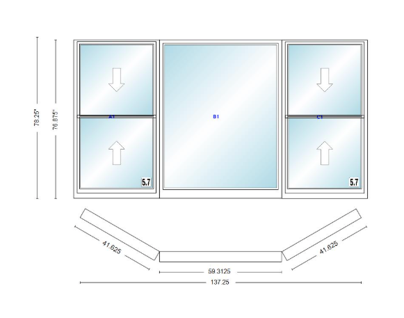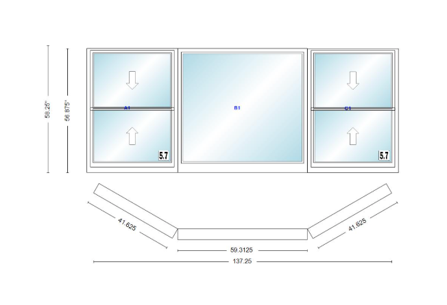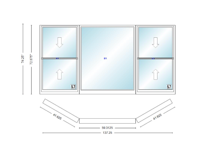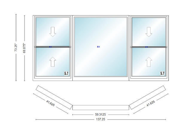 Andersen 400 series double hung bay window 137 1/4" wide picture with double hung flankers 30 degree angle of deflection vinyl exterior wood interior low-e4 dual pane argon gas
