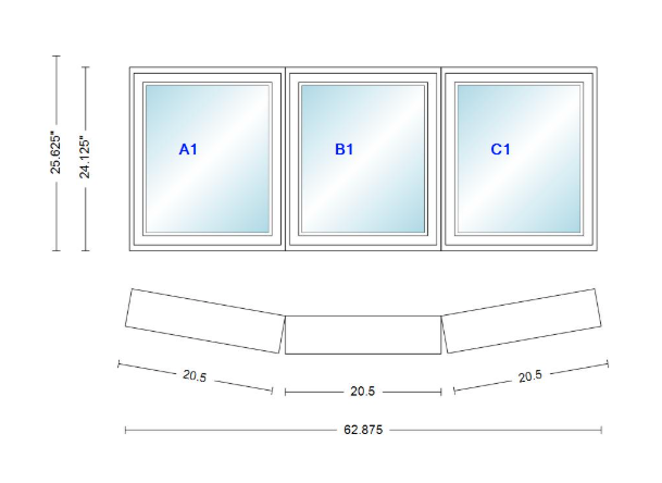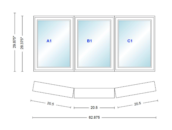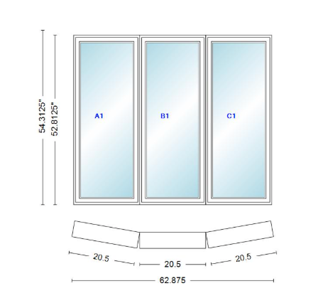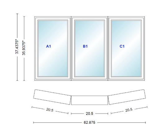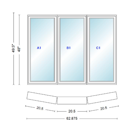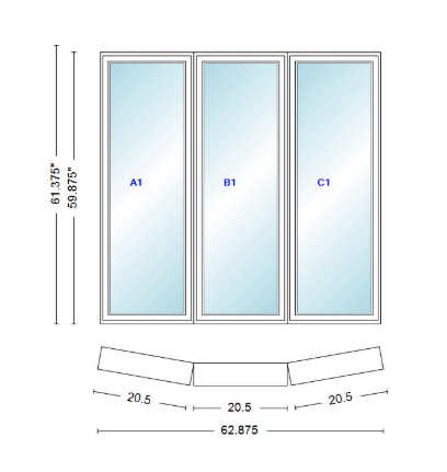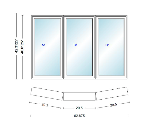 Andersen 400 series 3 wide casement bow window 62 7/8" wide fixed casement with casement flankers 10 degree angle of deflection vinyl exterior wood interior low-e4 dual pane argon gas
