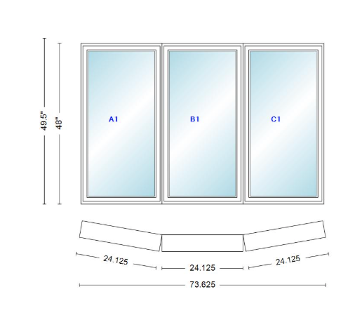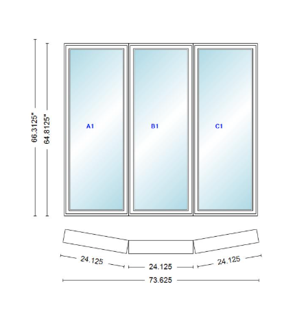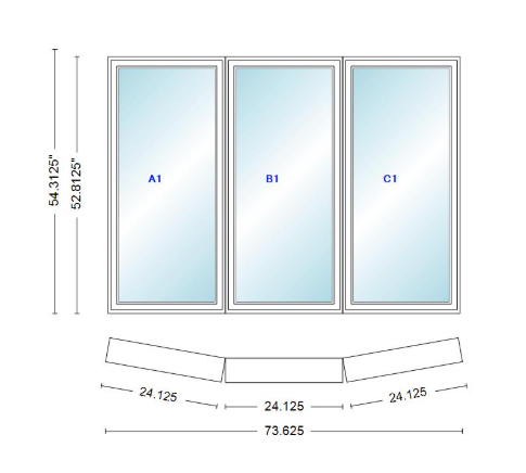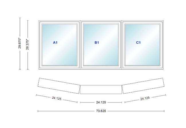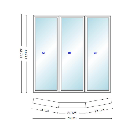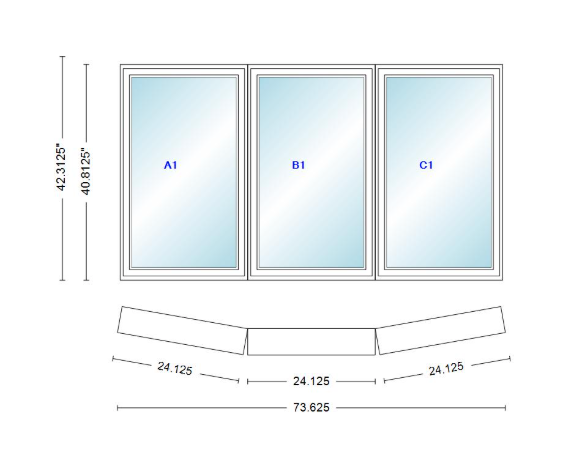 Andersen 400 series 3 wide casement bow window 73 5/8" wide fixed casement with casement flankers 10 degree angle of deflection vinyl exterior wood interior low-e4 dual pane argon gas