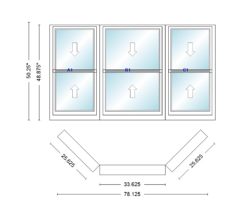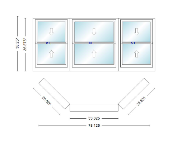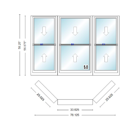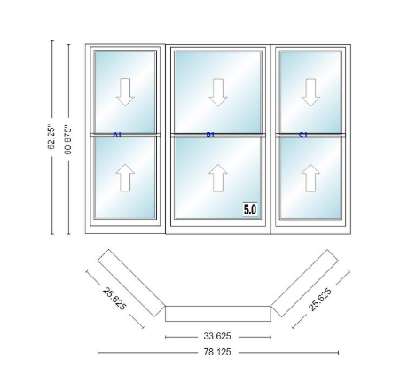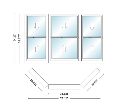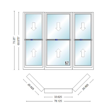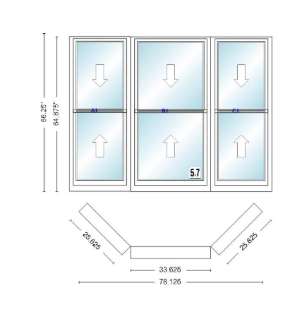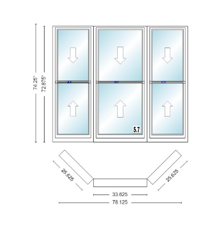 Andersen 400 series double hung bay window 78 1/8" wide double hung with double hung flankers 45 degree angle of deflection vinyl exterior wood interior low-e4 dual pane argon gas