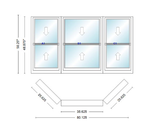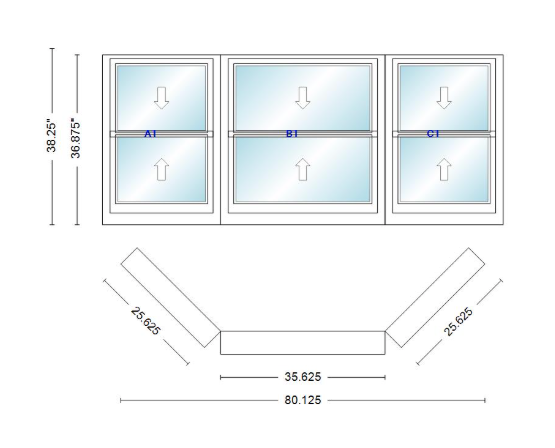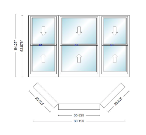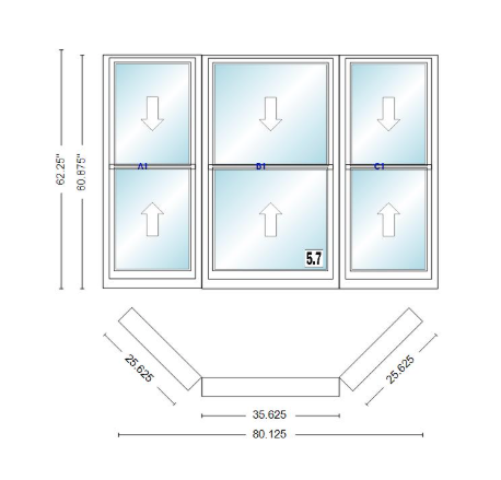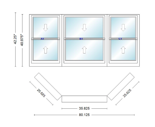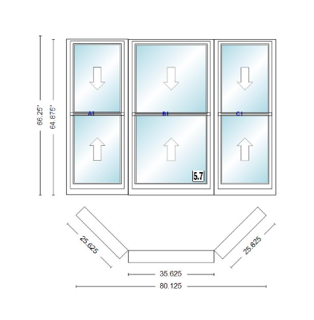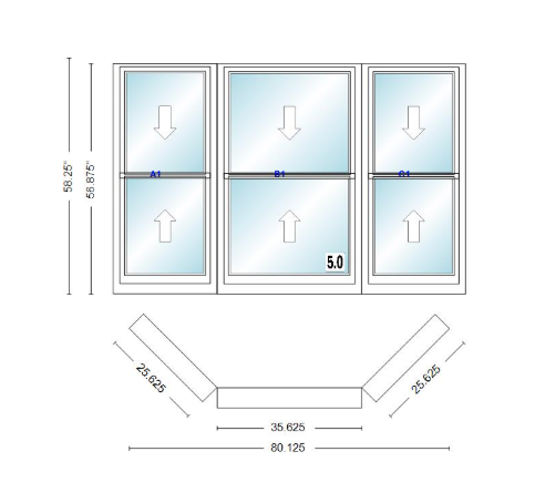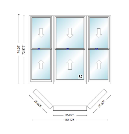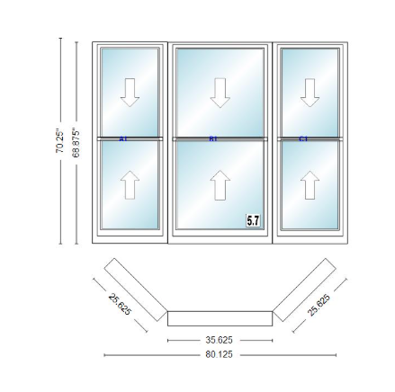 Andersen 400 series double hung bay window 80 1/8" wide double hung with double hung flankers 45 degree angle of deflection vinyl exterior wood interior low-e4 dual pane argon gas