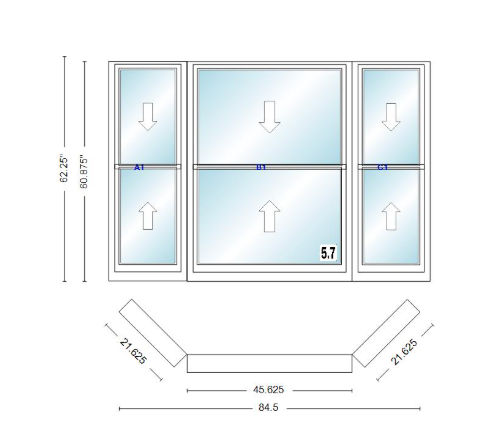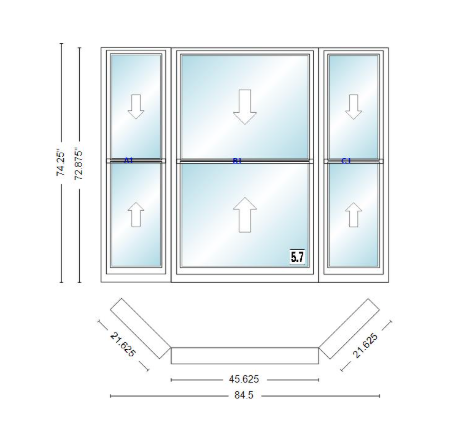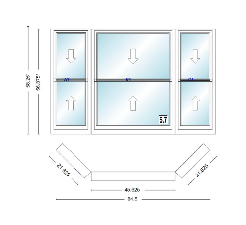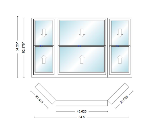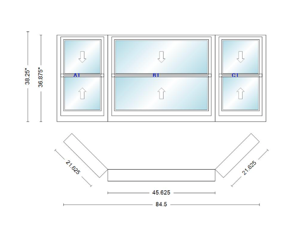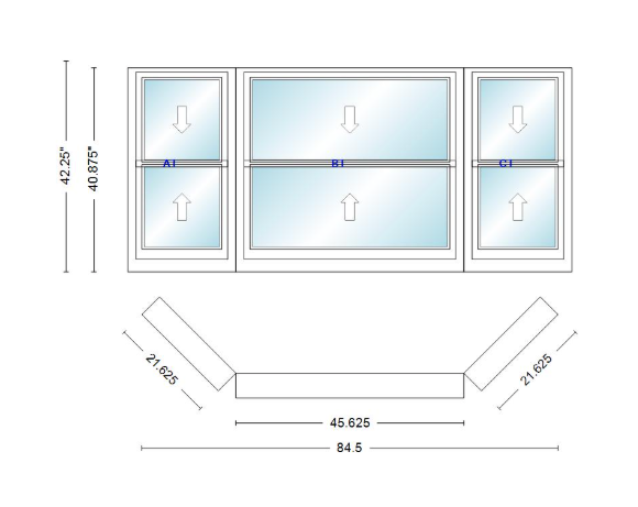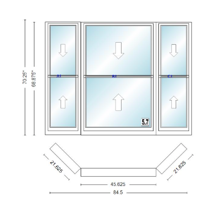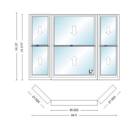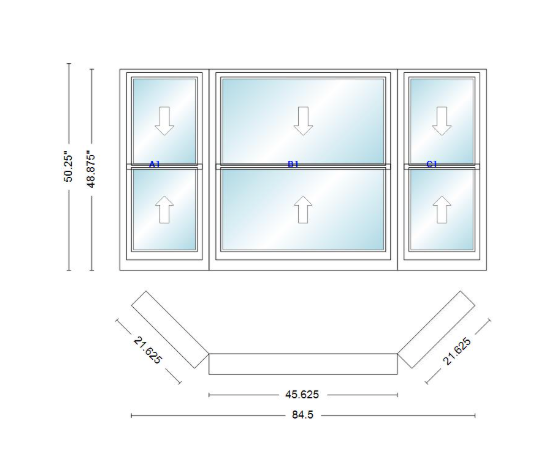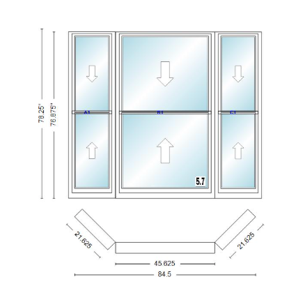 Andersen 400 series double hung bay window 84 1/2" wide double hung with double hung flankers 45 degree angle of deflection vinyl exterior wood interior low-e4 dual pane argon gas
