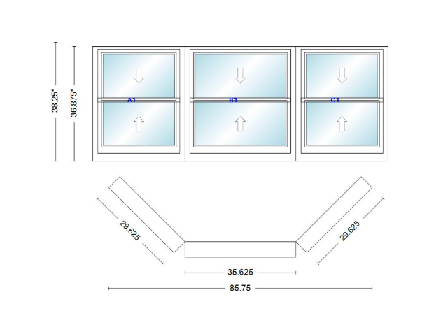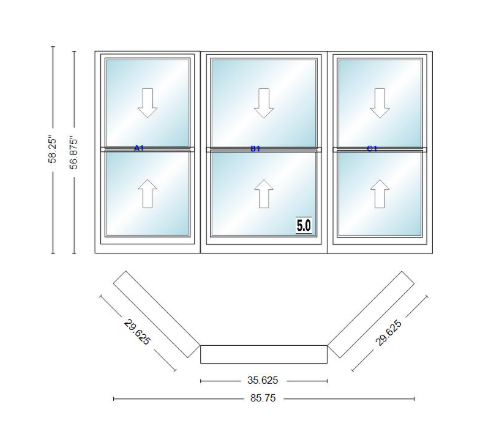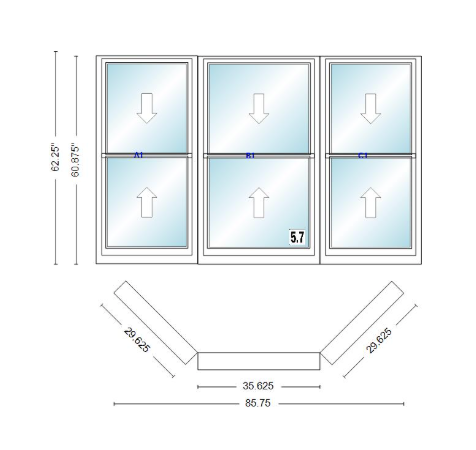 Andersen 400 series double hung bay window 85 3/4" wide double hung with double hung flankers 45 degree angle of deflection vinyl exterior wood interior low-e4 dual pane argon gas