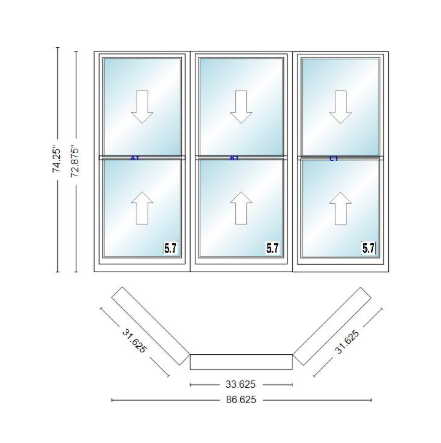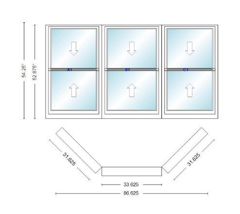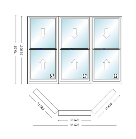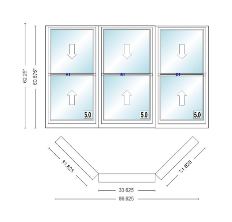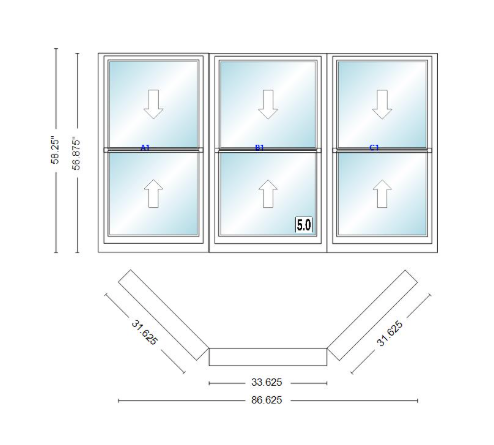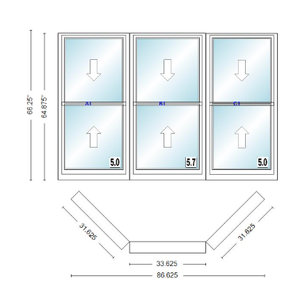 Andersen 400 series double hung bay window 86 5/8" wide double hung with double hung flankers 45 degree angle of deflection vinyl exterior wood interior low-e4 dual pane argon gas