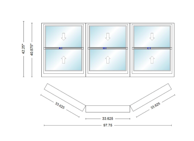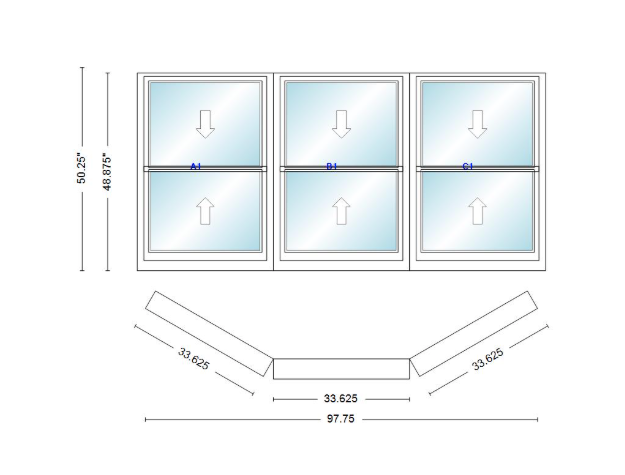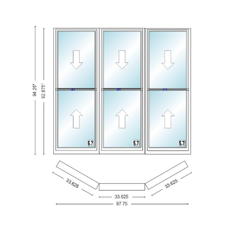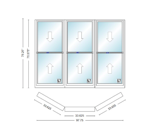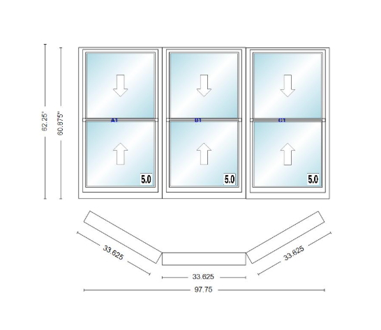 Andersen 400 series double hung bay window 97 3/4" wide double hung with double hung flankers 30 degree angle of deflection vinyl exterior wood interior low-e4 dual pane argon gas