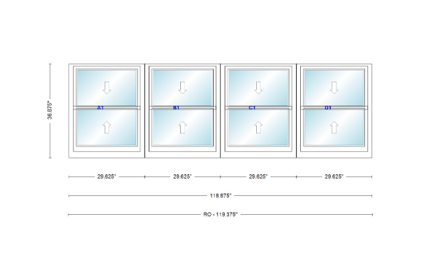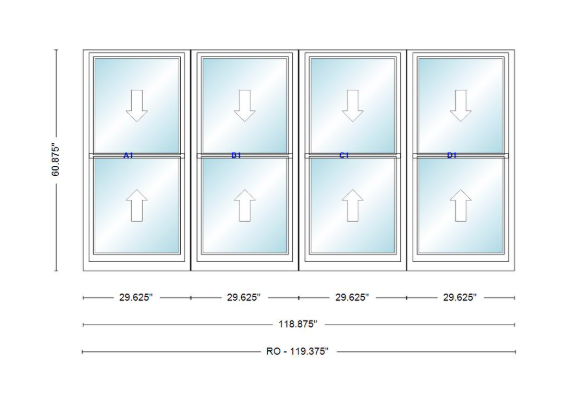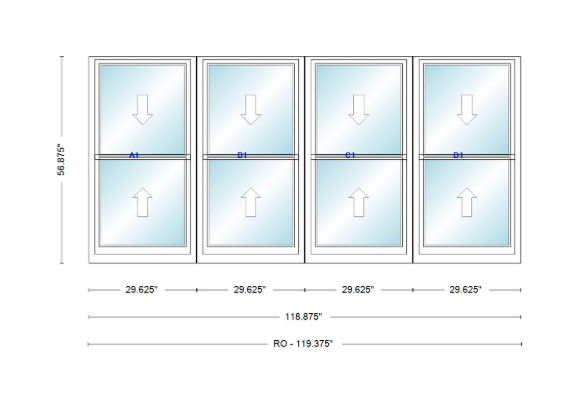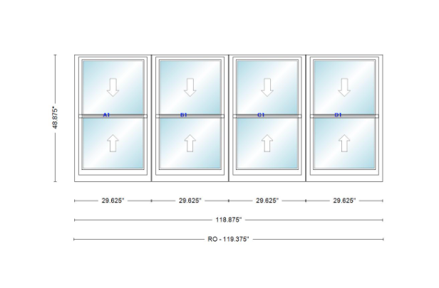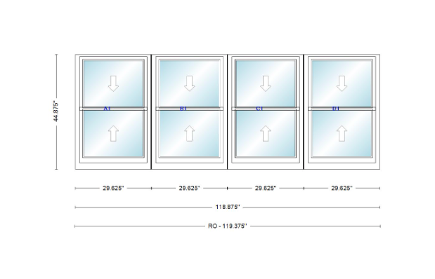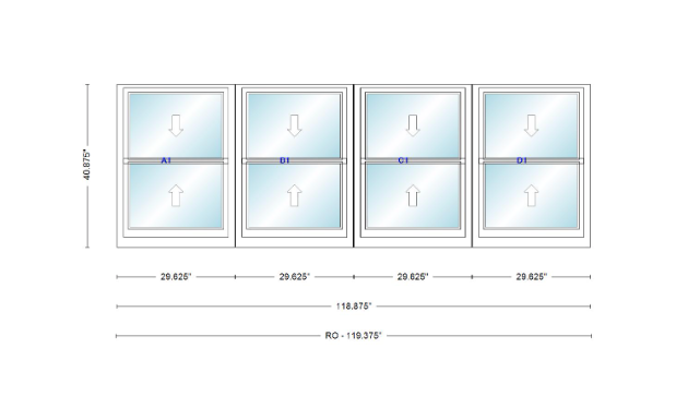 ANDERSEN windows 400 series quad double hung 118-7/8" wide vinyl exterior wood interior new construction low-e4 dual pane argon fill glass full screens/grilles/tempered optional