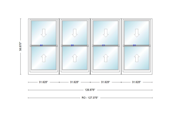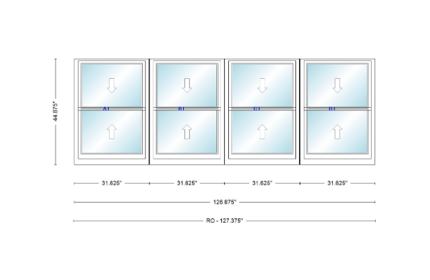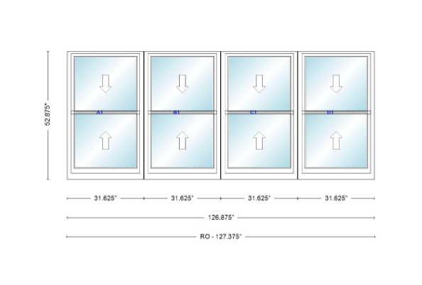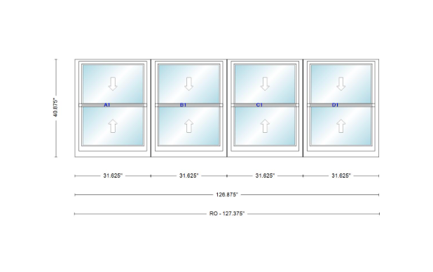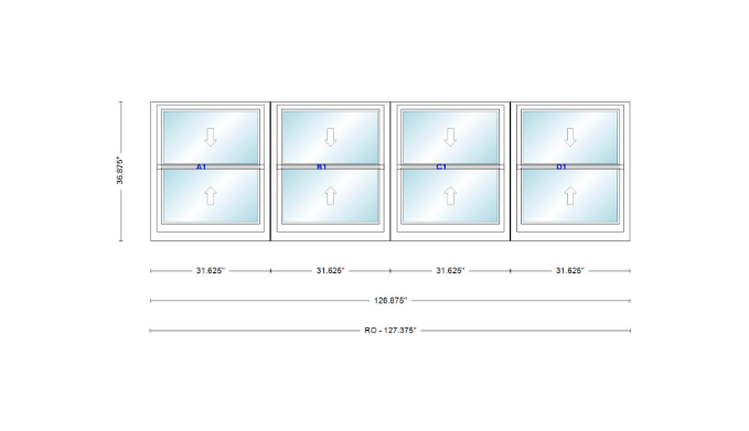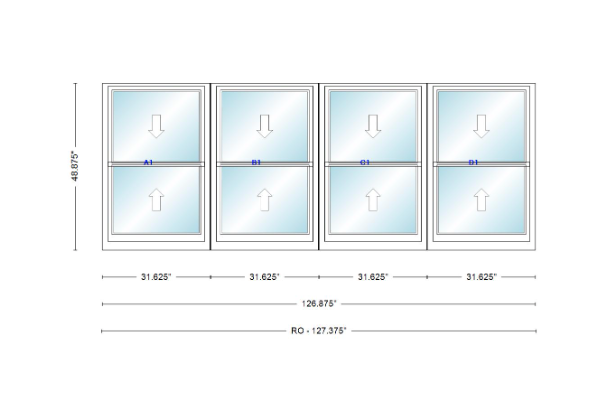 ANDERSEN windows 400 series quad double hung 126-7/8" wide vinyl exterior wood interior new construction low-e4 dual pane argon fill glass full screens/grilles/tempered optional