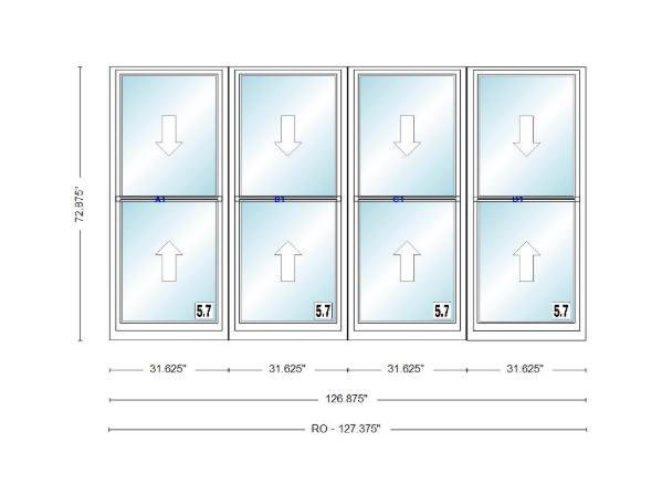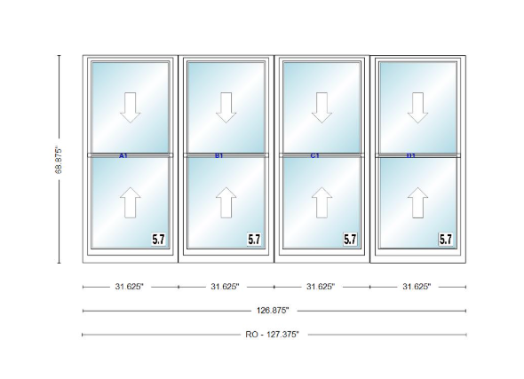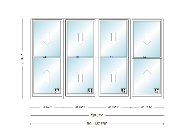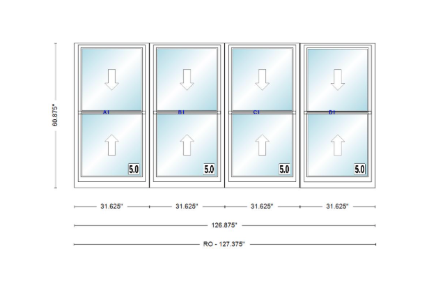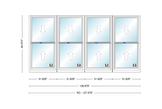/ ANDERSEN Windows 400 Series Quad Double Hung 126-7/8" Wide Vinyl Exterior Wood Interior New Construction Low-E4 Dual Pane Argon Fill Glass Full Screens/Grilles/Tempered Optional