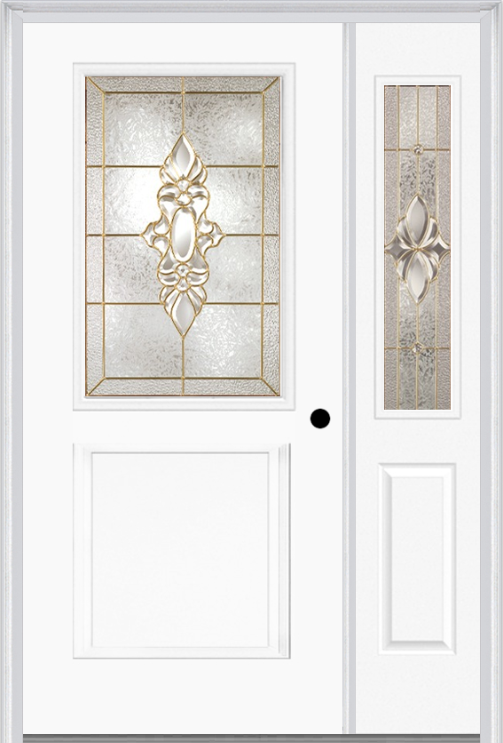 / MMI 1/2 Lite 1 Panel 6'8" Fiberglass Smooth Heirlooms Brass Or Heirlooms Satin Nickel Exterior Prehung Door With 1 Half Lite Heirlooms Brass/Satin Nickel Decorative Glass Sidelight 682