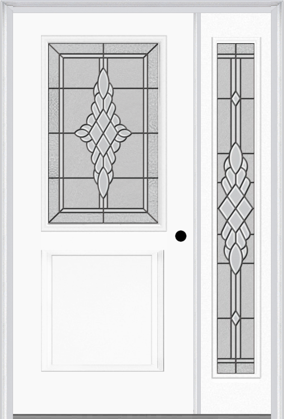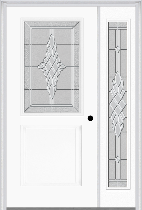 MMI 1/2 Lite 1 Panel 6'8" Fiberglass Smooth Grace Nickel Or Grace Patina Exterior Prehung Door With 1 Full Lite Grace Nickel/Patina Decorative Glass Sidelight 682