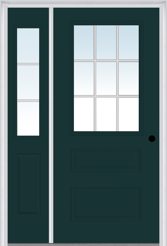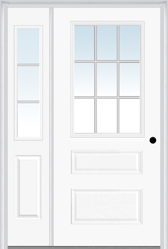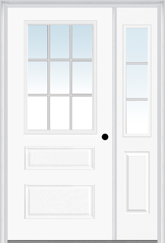 MMI 1/2 lite horizontal 2 panel 3'0" x 6'8" fiberglass smooth white grilles between glass exterior prehung door with 1 half lite white grilles between glass sidelight 631 gbg 692 gbg