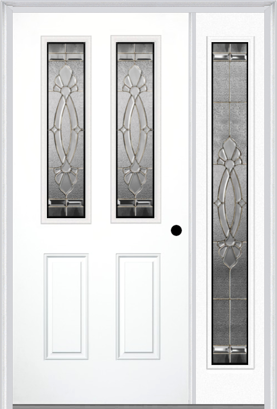 MMI 2-1/2 lite 2 panel 6'8" fiberglass smooth belaire zinc exterior prehung door with 1 full lite belaire zinc decorative glass sidelight 692