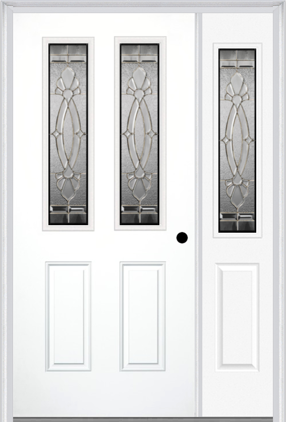 MMI 2-1/2 lite 2 panel 6'8" fiberglass smooth belaire zinc exterior prehung door with 1 half lite belaire zinc decorative glass sidelight 692