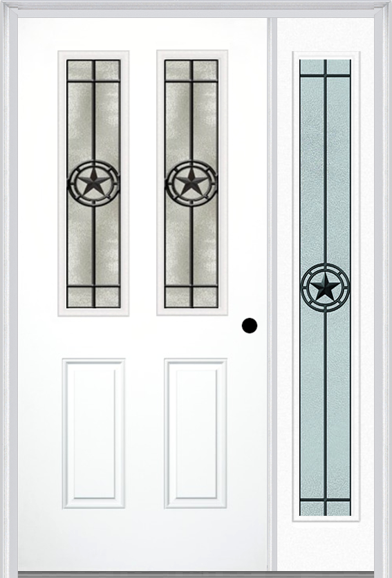 MMI 2-1/2 Lite 2 Panel 6'8" Fiberglass Smooth Elegant Star Wrought Iron Exterior Prehung Door With 1 Full Lite Elegant Star Wrought Iron Decorative Glass Sidelight 692