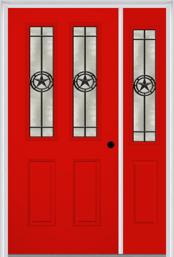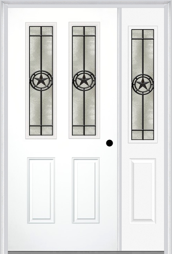 MMI 2-1/2 lite 2 panel 6'8" fiberglass smooth elegant star wrought iron exterior prehung door with 1 half lite elegant star wrought iron decorative glass sidelight 692