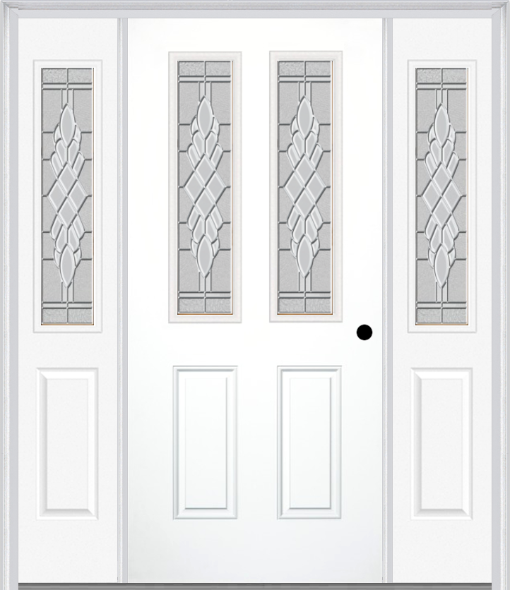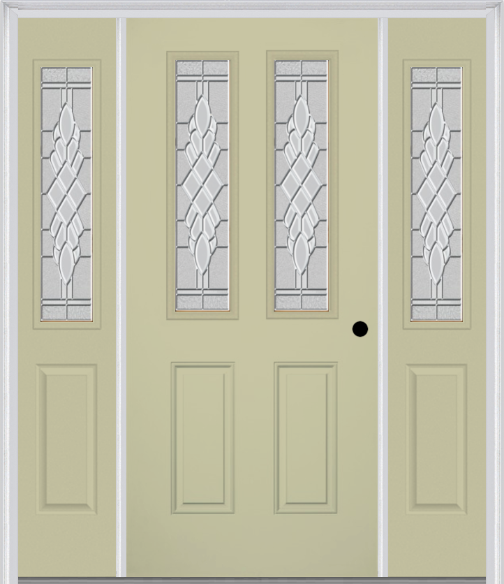 MMI 2-1/2 Lite 2 Panel 6'8" Fiberglass Smooth Grace Nickel Or Grace Patina Exterior Prehung Door With 2 Half Lite Grace Nickel/Patina Decorative Glass Sidelights 692