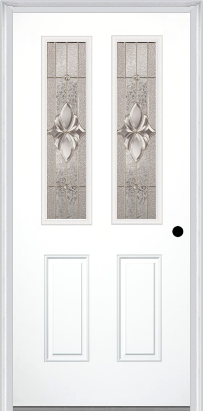 MMI 2-1/2 Lite 2 Panel 6'8" Fiberglass Smooth Heirlooms Brass Or Heirlooms Satin Nickel Decorative Glass Exterior Prehung Door 692