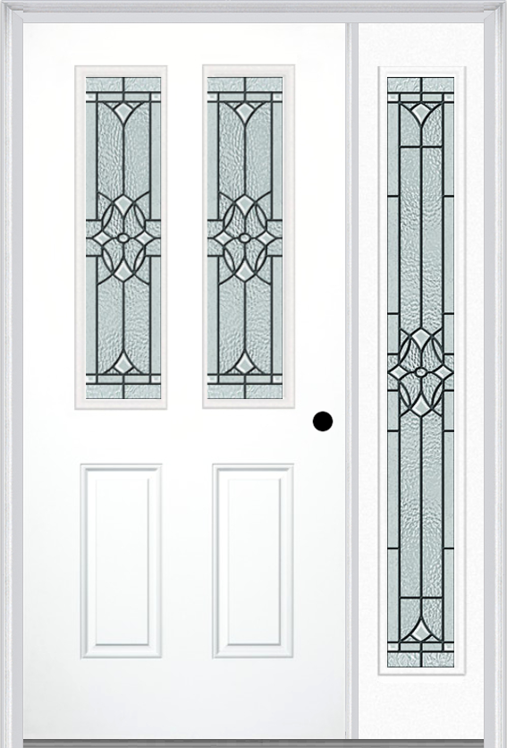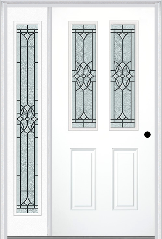 MMI 2-1/2 Lite 2 Panel 6'8" Fiberglass Smooth Selwyn Patina Exterior Prehung Door With 1 Full Lite Selwyn Patina Decorative Glass Sidelight 692