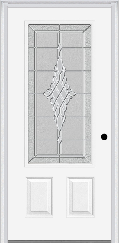 MMI 3/4 lite 2 panel 3'0" x 6'8" fiberglass smooth grace nickel or grace patina decorative glass exterior prehung door 607