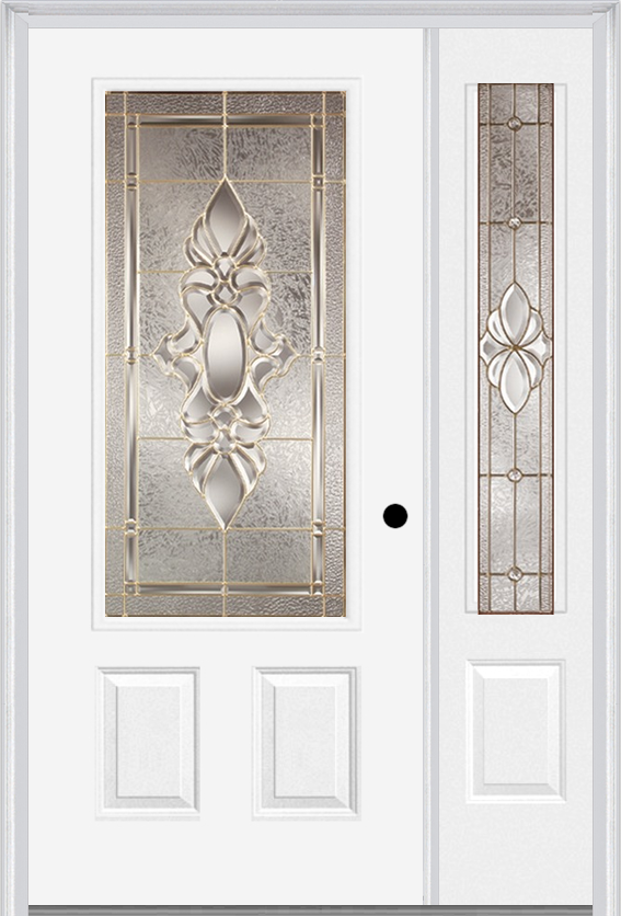 MMI 3/4 lite 2 panel 6'8" fiberglass smooth heirlooms brass or heirlooms satin nickel exterior prehung door with 1 heirlooms brass/satin nickel 3/4 lite decorative glass sidelight 607