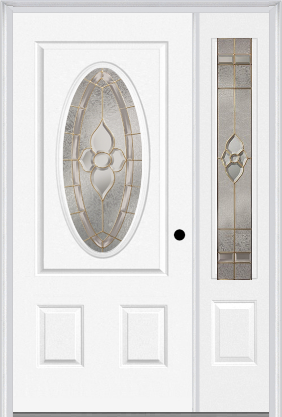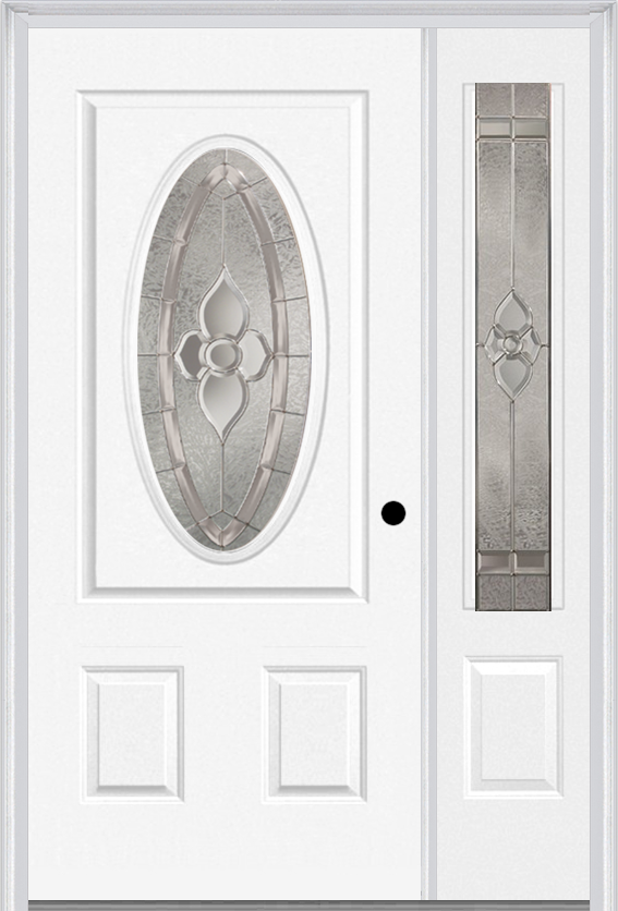 MMI small oval 2 panel 3'0" x 6'8" fiberglass smooth nouveau nickel or nouveau patina exterior prehung door with 1 nouveau brass/nickel/patina 3/4 lite decorative glass sidelight 949