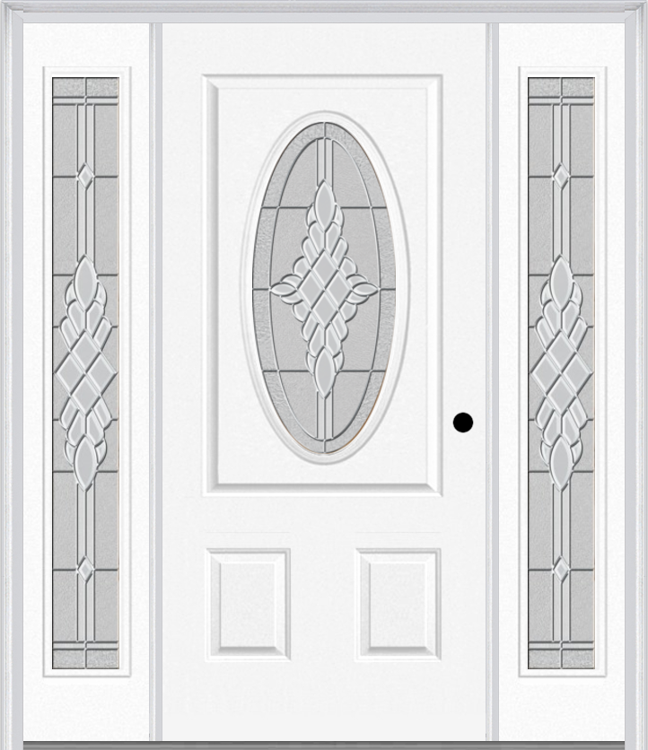 MMI SMALL OVAL 2 PANEL 6'8" FIBERGLASS SMOOTH GRACE NICKEL OR GRACE PATINA EXTERIOR PREHUNG DOOR WITH 2 FULL LITE GRACE NICKEL/PATINA DECORATIVE GLASS SIDELIGHTS 949