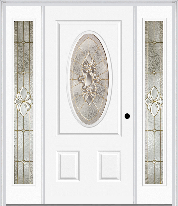 MMI SMALL OVAL 2 PANEL 6'8" FIBERGLASS SMOOTH HEIRLOOMS BRASS OR HEIRLOOMS SATIN NICKEL EXTERIOR PREHUNG DOOR WITH 2 FULL LITE HEIRLOOMS BRASS/SATIN NICKEL DECORATIVE GLASS SIDELIGHTS 949