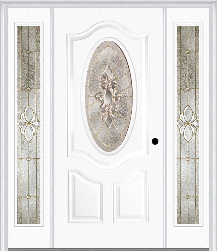 MMI SMALL OVAL 2 PANEL DELUXE 6'8" FIBERGLASS SMOOTH HEIRLOOMS BRASS OR HEIRLOOMS SATIN NICKEL EXTERIOR PREHUNG DOOR WITH 2 FULL LITE HEIRLOOMS BRASS/SATIN NICKEL DECORATIVE GLASS SIDELIGHTS 749