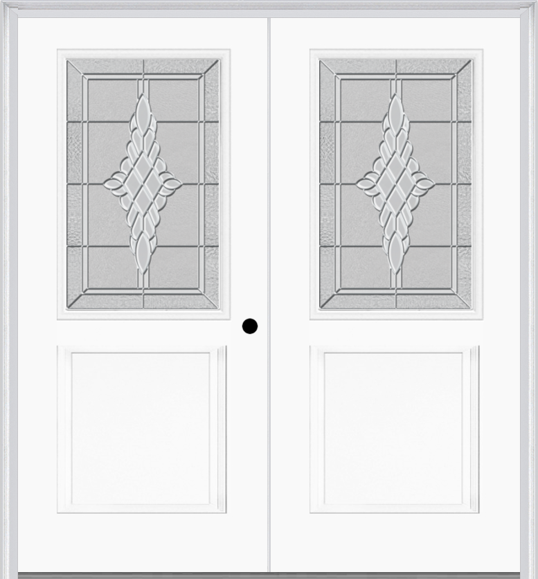 MMI TWIN/DOUBLE 1/2 LITE 1 PANEL 6'8" FIBERGLASS SMOOTH GRACE NICKEL OR GRACE PATINA DECORATIVE GLASS EXTERIOR PREHUNG DOOR 682