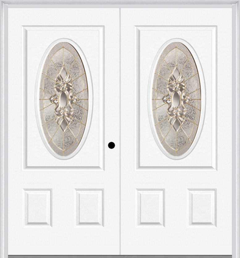 MMI twin/double small oval 2 panel 6'8" fiberglass smooth heirlooms brass or heirlooms satin nickel decorative glass exterior prehung door 949